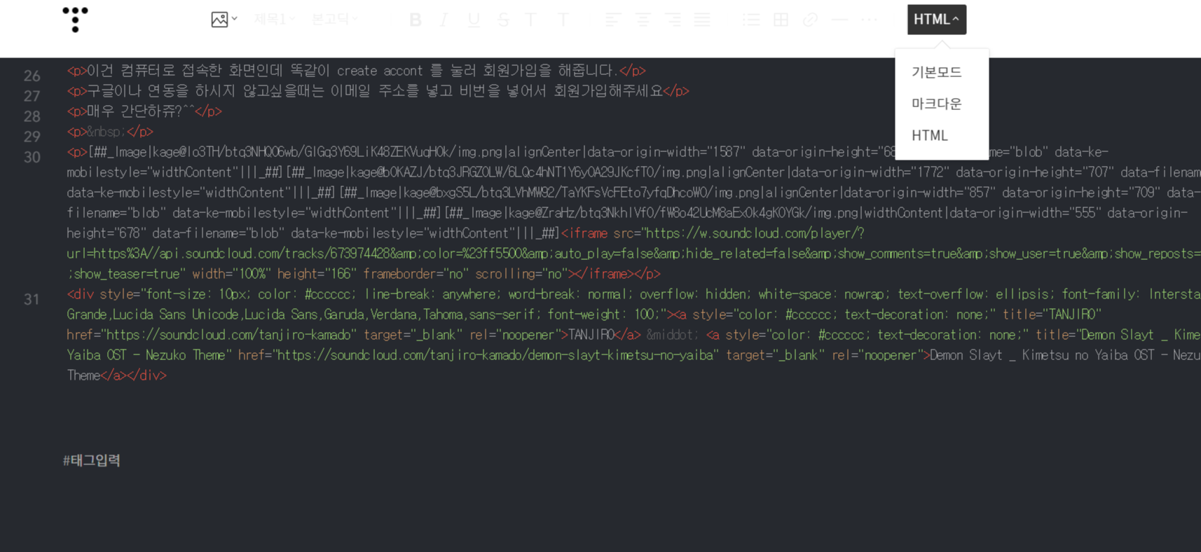 티블로그 포스팅 작성시 HTML로 바꿔서 복사한것 <p>여기에 코드 붙여넣기 (ctrl+v) </p>