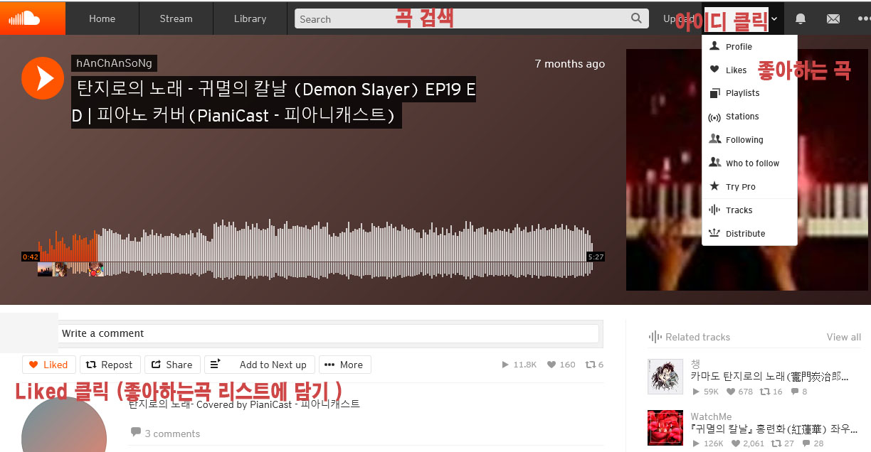 곡을 듣다가 마음에 들면 플레이 밑 (아래 그림참고) likes만 누르면 리스트에 추가되고 아이디 밑에 Likes를 눌러서 들어가면 되요.