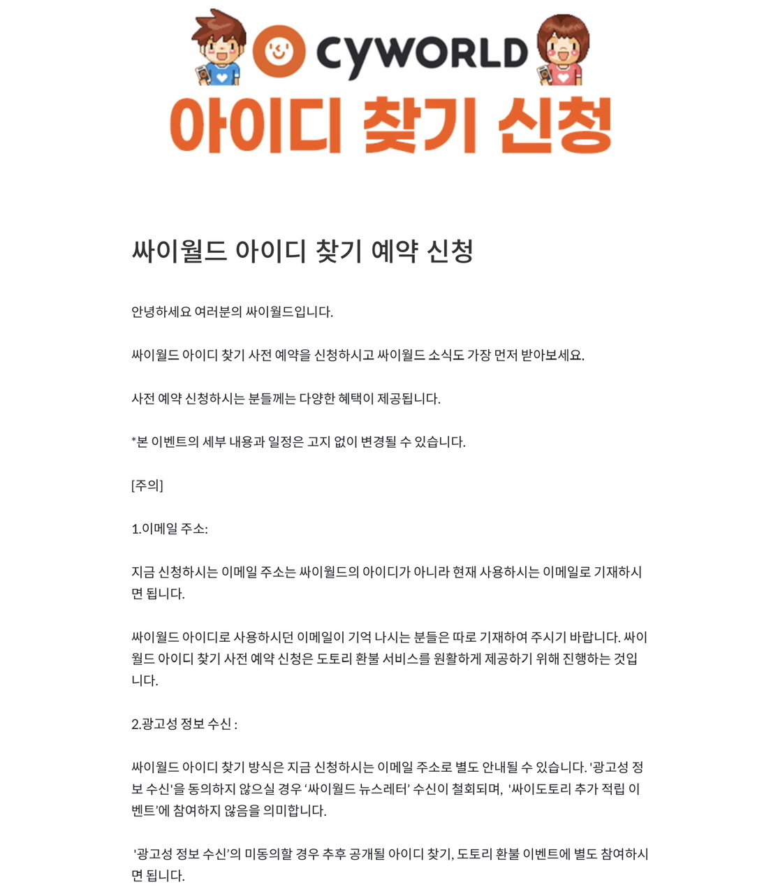 싸이월드 사이트에 들어가서 왼쪽 아이디 찾기 신청을 누르면 사전예약이 됩니다