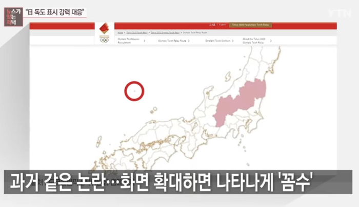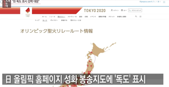 도쿄올림픽 홈페이지 내 성화 봉송 코스를 소개하는 전국 지도에서 시마네 현 위쪽 독도 위치에 해당하는 곳에 작은 점을 찍어 독도를 일본 영토라고 표시하고 있는 것에 대해 정부가 시정을 요구했지만 지도를 확대해야만 드러나게 꼼수를 부리고 있습니다.