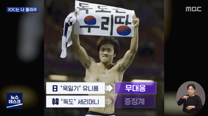 도쿄올림픽에서는 일본은 제국주의 상징인 '기미가요' 국가를 불렀고, 욱일기 대형을 만들기도 했지만 우리는 자국에서 열렸던 2018년 평창올림픽 피겨 아이스댄스 프리 경기에서 한국 대표팀인 민유라와 겜린 선수의 배경음악인 '홀로 아리랑’의 가사에 ‘독도야 간밤에 잘 잤느냐’라는 구절이 ”정치적 논란의 여지가 있다”는 일본의 항의로 국제올림픽위원회(IOC)의 지적에 따라 결국 가사 중 '독도'를 삭제해야 하는 설움을 당했습니다.