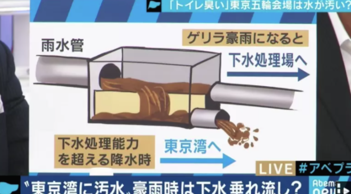일본 도쿄 미나토구는 합류식 하수도를 이용하고있고 생활오수와 화장실 하수인 똥물, 빗물을 같은 관 속에 모아 한꺼번에 배출하는 방식인데 일정량 이상의 집중호우나 태풍등 게릴라성 호우가 내리면 오수와 똥물이 정화되지 못한 채 곧바로 하천으로 흘러가게 되는데 특히 강수량이 많은 7-8월에는 이러한 오수들이 오다이바 해상공원으로 방류되고 있는 가능성에 대한 충격적인 사실이 알려졌습니다.