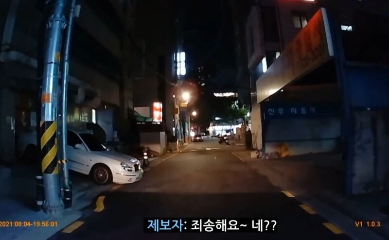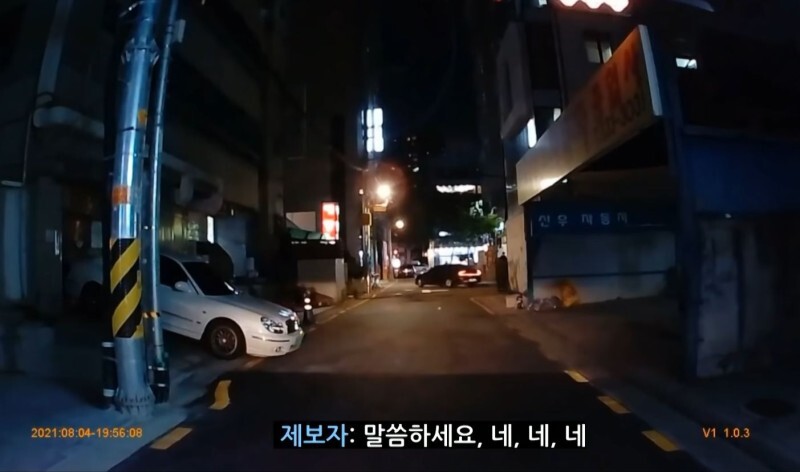 남자가 서있는 지점에서 바로 좌회전하며 진직 하는 차 뒤에서 눈이 마주친 그 남자가 미친 듯이 뛰어와 차 문을 두들기며 차를 멈춰 세웠고, A 씨는 남자의 행동에 너무 놀라 자신이 골목길을 지나가면서 혹시 행인과 부딪혔나 하는 생각이 들어 차를 멈추고 죄송하다고 했는데 남성은 다짜고짜 차 문을 열라고 합니다.