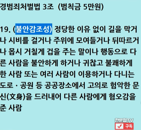 이에 대해 진행자인 한문철 변호사는 경범죄 처벌법 3조의 범칙금 5만 원에 대해 얘기를 했는데요.