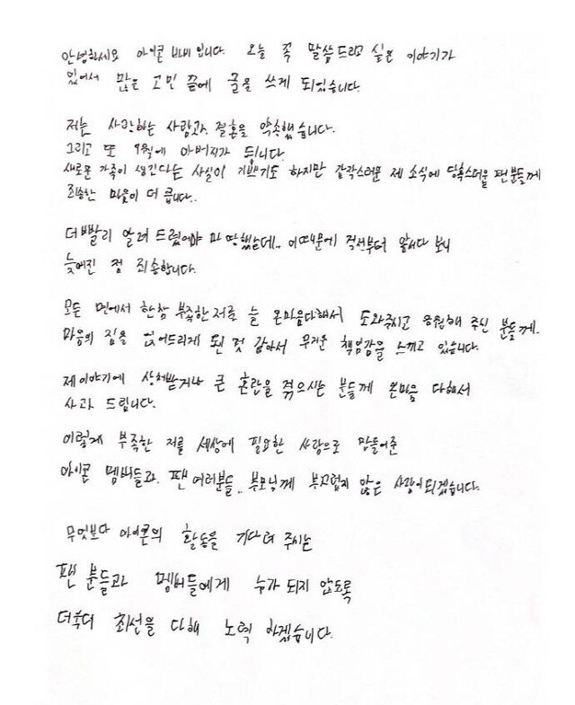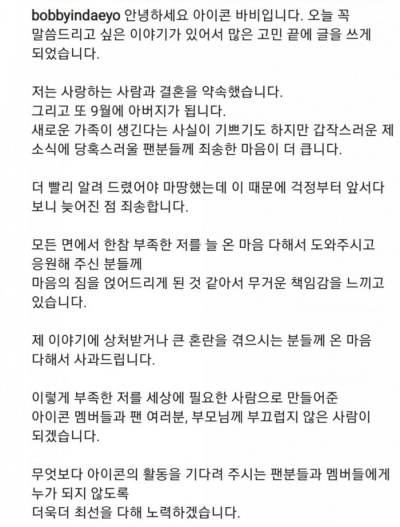 2021년 8월 20일 오후 7시 그룹 아이콘 '바비는 자신의 SNS에 손편지를 게재하며 "사랑하는 사람과 결혼을 약속했다. 그리고 또 9월에 아버지가 된다"며 “새로운 가족이 생긴다는 사실이 기쁘기도 하지만 갑작스러운 제 소식에 당혹스러울 팬분들께 죄송한 마음이 더 크다”라고 깜짝 고백을 했습니다.