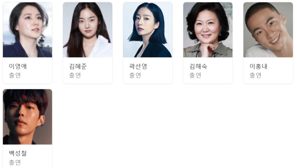 이영애를 시작으로 넷플릭스 '킹덤' 시리즈로 떠오른 신예 김혜준, '슬기로운 의사생활'의 곽선영과 김해숙, OCN 드라마 '경이로운 소문'에서 악귀 지청신 이홍 내, 넷플릭스 오리지널에서 '봉디 선생님'의 조현철 배우가 출연합니다.