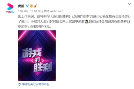 여우쿠 측은 "이미 폐기했던 초고를 실수로 사용했다"라고 사과하면서 프로그램명을 '게임의 승리'로 수정했지만 중국 누리꾼들은 여우쿠에 표절하지 말 것을 요구하고 있으며, 비난은 가라앉지 않고 있습니다.