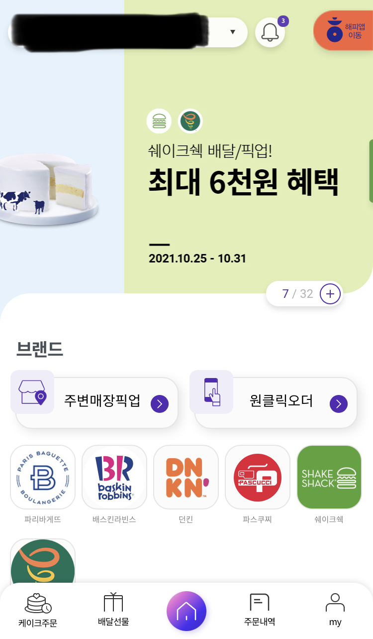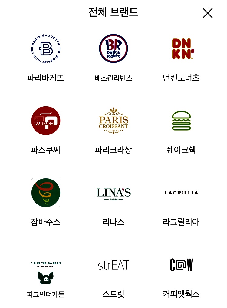 해피콘 모바일 쿠폰으로 사용할 수 있는 브랜드들은 SPC 계열사로 파리바게트, 배스킨라빈스, 던킨도너츠, 파스쿠찌, 파리크라상, 셰이크 쉑, 잠바주스, 리나스, 라그릴리아, 커피 앳 웍스, 패션 파이브, 빚은, 에그 슬럿, 시티 델리, 스트릿, SPC스퀘어, 패션 5, 빚은, 퀸즈 파크 등등인데 저는 배달시키려고 하니 집 주위에 있는 매장이 몇 군데 없네요 ㅎㅎ