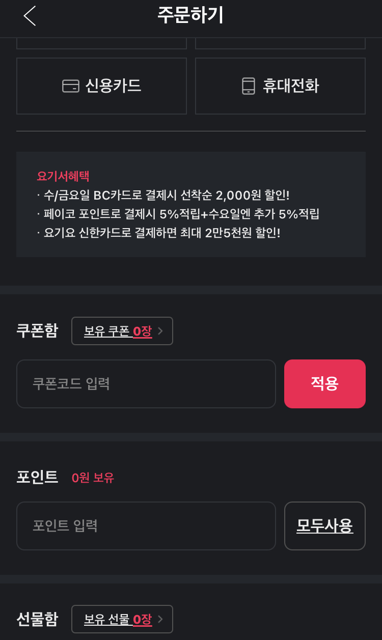 수, 금요일 BC카드로 결제 시 선착순 2,000 할인도 요일이 해당되면 5,000원 쿠폰에서 추가로 할인받을 수 있어요.