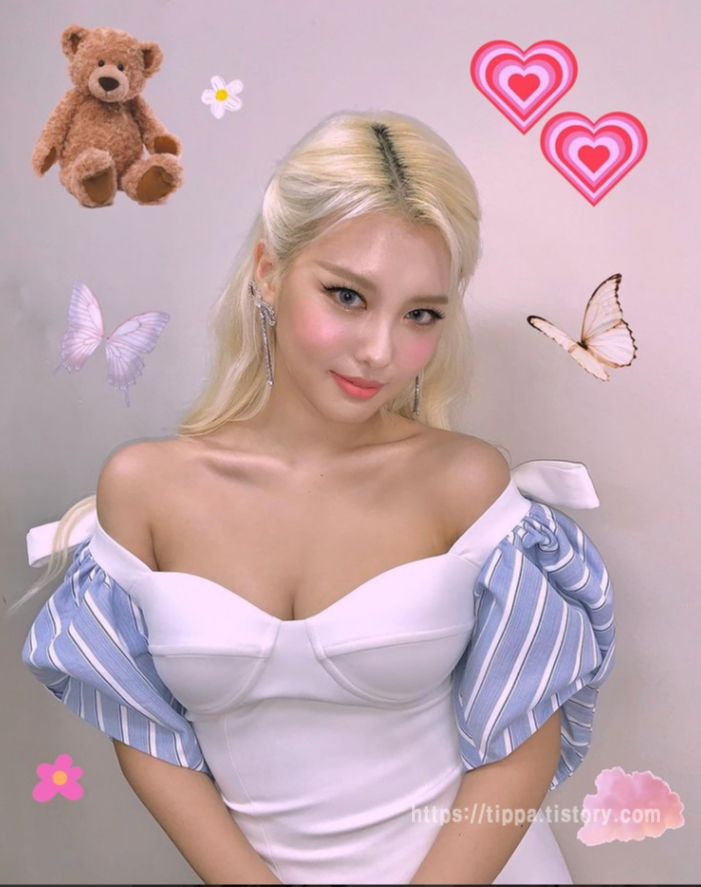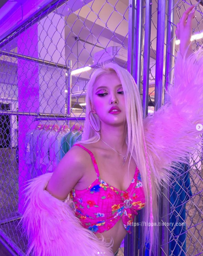 남다른 뒤태를 뽐내며 분홍색 긴 웨이브 헤어스타일과 선명한 이목구비로 인형 같은 비주얼을 완성했으며, 군살 하나 없는 잘록한 허리 라인과 작은 얼굴에 길쭉한 기럭지로 모델 같은 비율을 자랑해 시선을 사로잡았습니다.