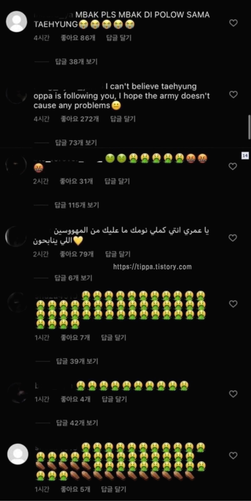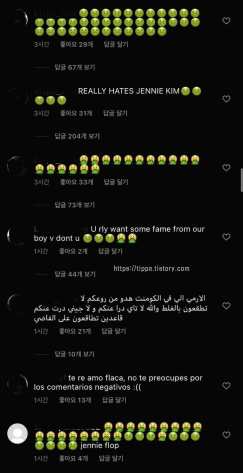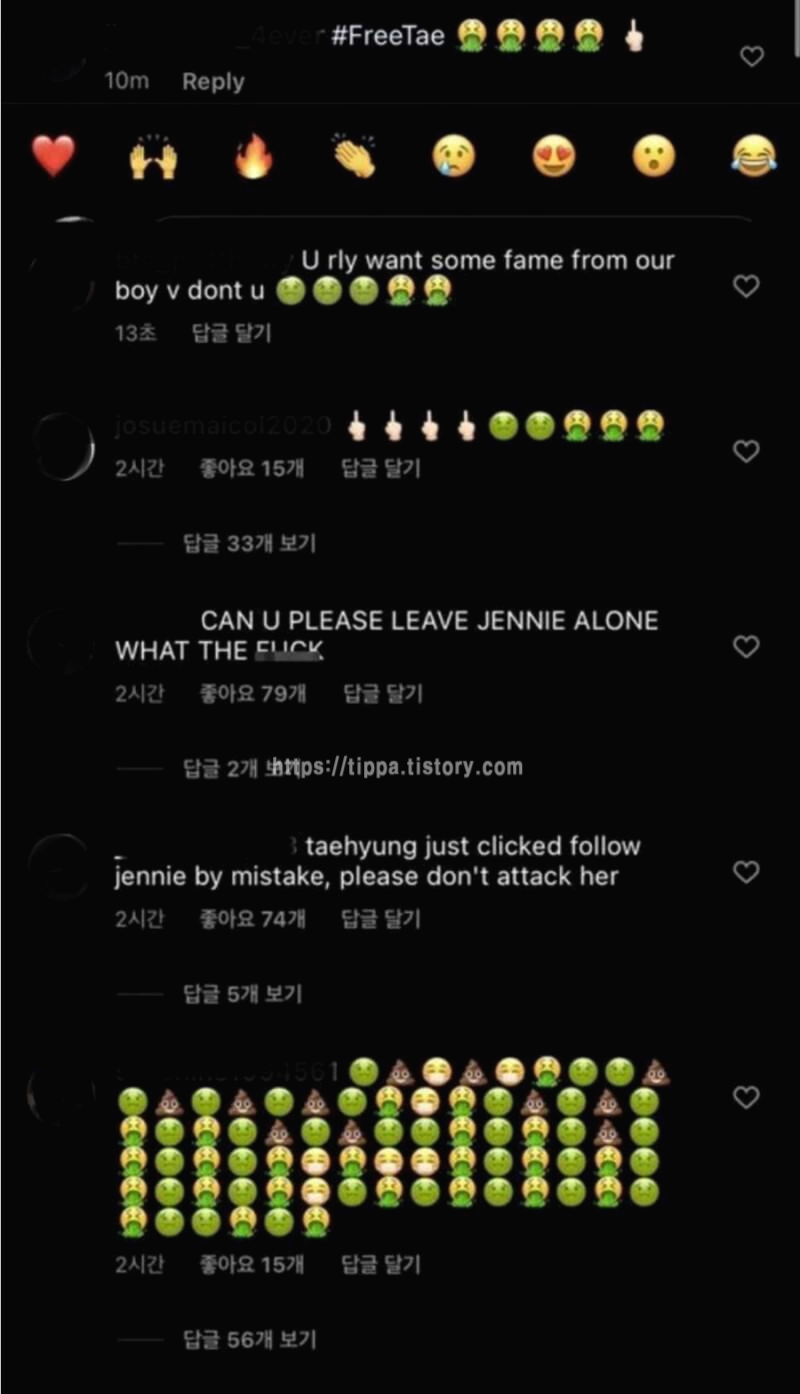 뷔의 해외 팬들로 추정되는 네티즌들이 제니의 인스타그램에 몰려가 '#FREETAE'(뷔를 놓아달라)', '뷔와 무슨 사이냐', '뷔를 내버려 둬라' 등의 악플로 댓글과 구토 모양 이모티콘, 욕설 이모티콘, 우는모양 이모티콘 으로 도배하며 분노를 표출하고 있습니다.