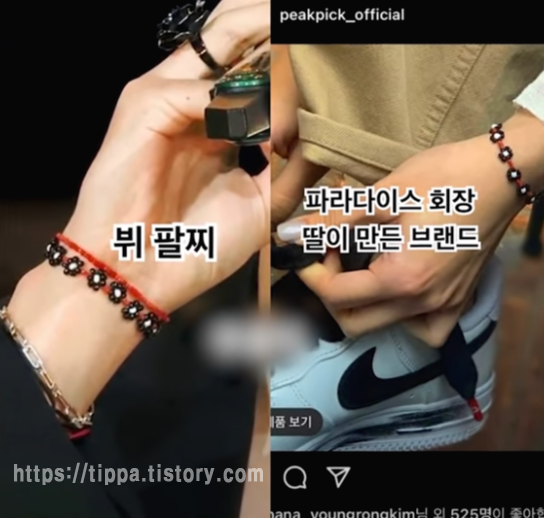 해당 팔찌는 방탄소년단의 또 다른 멤버 진이 뷔에게 선물로 준 것으로 알려졌으며, 뷔의 소속사 빅히트 뮤직은 “최 이사장의 가족과 뷔는 지인일 뿐”이라며 열애설을 일축했습니다.