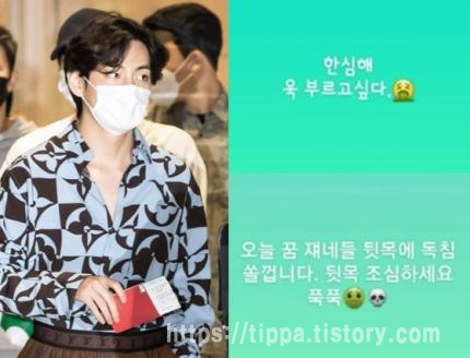 해당 글에서 뷔는 “한심해, ‘욱’ 부르고 싶다”라며 “오늘 꿈 쟤네들 뒷목에 독침 쏠 겁니다. 뒷목 조심하세요 푹푹”이라는 글을 남기며 화가 난듯한 심경이 드러나는 표현을 했습니다.