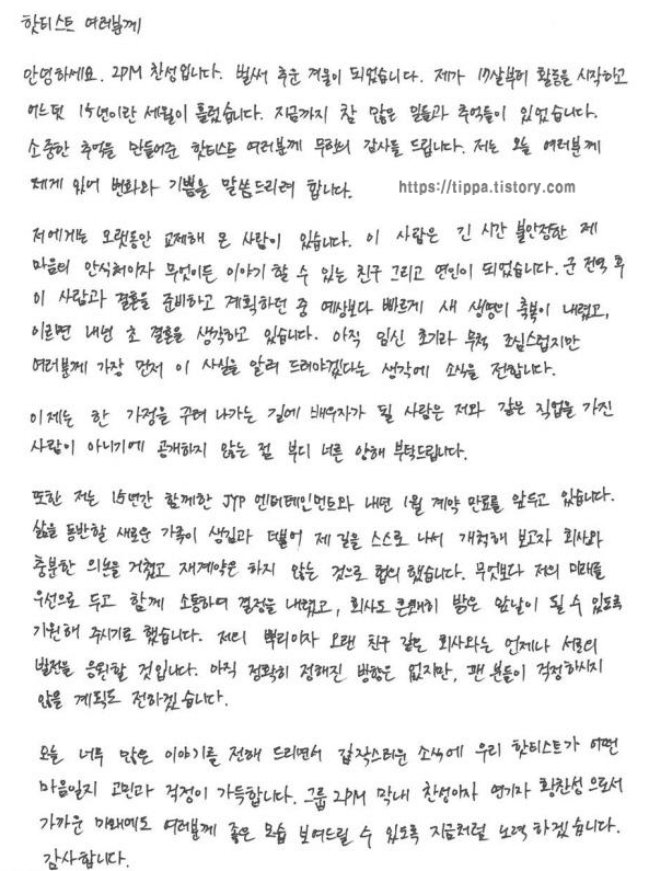 황찬성은 "갑작스러운 소식에 우리 핫티스트(2pm 팬클럽)가 어떤 마음일지 고민과 걱정이 가득하다"면서 "2PM 막내 찬성이자 연기자 황찬성으로서 가까운 미래에도 여러분께 좋은 모습 보여줄 수 있도록 지금처럼 노력하겠다"라고 약속했습니다.
