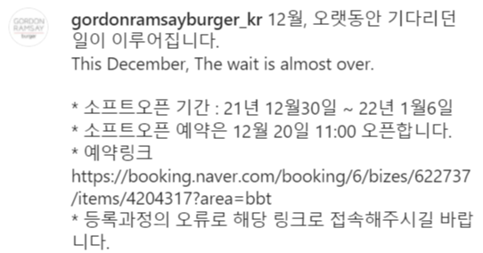전 세계적인 스타 셰프 고든 램지가 지난 20일부터 임시 오픈 기간 매장에 방문할 수 있는 사전예약을 진행했으며, 신청자에 한해 오는 30일부터 1월 6일까지 매장 방문이 가능하고 정식 개점일은 1월 7일 입니다.