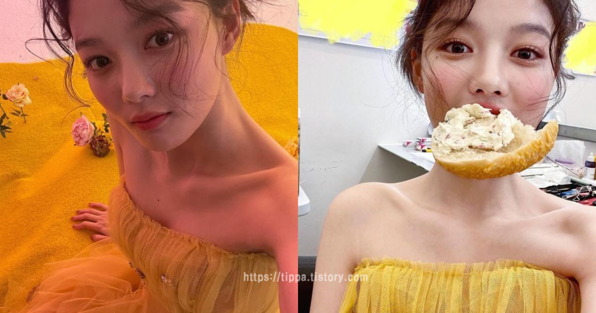 사진 속 김유정은 빵을 입에 물고 장난스럽게 사진을 찍고 있어, 김유정의 활발한 성격을 엿볼 수 있어 눈길을 끕니다.