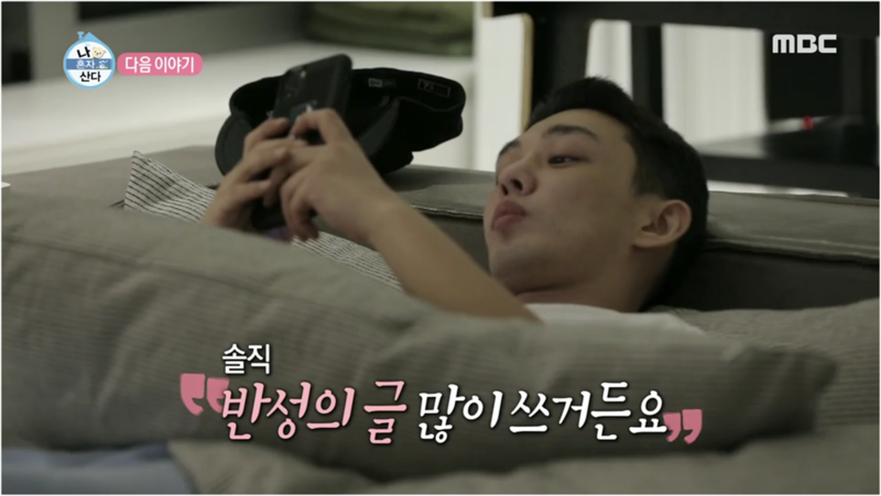 유아인은 일어나자마자 해독주스와 유산균으로 아침을 해결하고 시간이 조금 지난 후 고구마 셰이크를 만들어 먹는 등 연이어 액체 식사를 했는데 욕실 끝에 앉아있는 걸 좋아한다고 합니다.