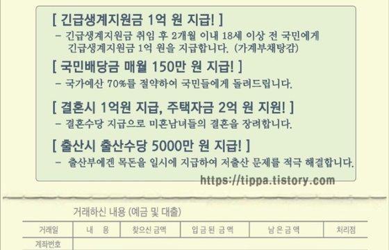 또, “의료보험은 중산층까지 면제하고 반려동물 무료진료 카드를 주고, 30세까지 안경을 무료로 쓸 수 있도록 안경 무료 카드를 줄 것. 생일 땐 금일봉과 대통령의 축하 카드가 든 케이크를 주겠다. 돈 걱정 안 하는 나라를 반드시 만들겠다”고 덧붙였습니다.