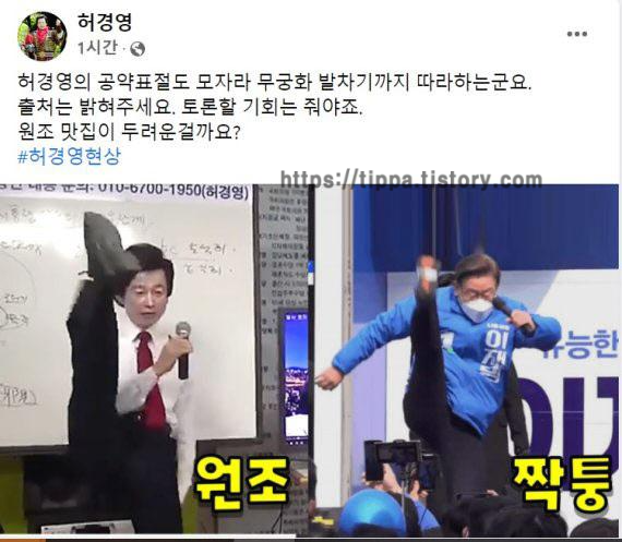 허 후보는19일 자신의 페이스북에 이 후보의 발차기 사진과 자신의 사진을 나란히 올리면서, 자신은 ‘원조’, 이 후보는 ‘짝퉁’이라고 주장하며, “허경영의 공약표절도 모자라 무궁화 발차기까지 따라하는군요”라며 “출처는 밝혀주세요. 토론할 기회는 줘야죠. 원조 맛집이 두려운 걸까요?”라고 적었다. 이어 ‘허경영 현상’이라는 해시태그를 덧붙였습니다.