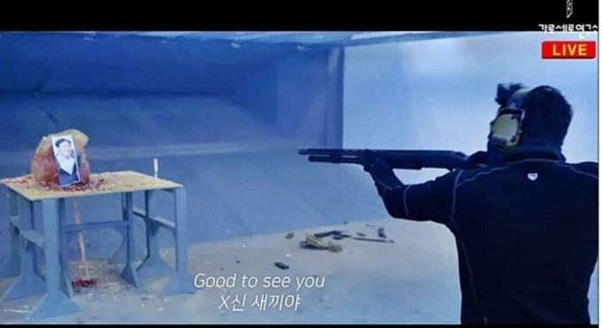 “능력 없는 X끼들”이라고 덧붙이기도 했으며, 이날 그는 김정은 국무위원장 사진에도 총을 쐈습니다.