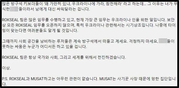 그러면서 "그때까지 사회 공간을 낭비하는 루저들은 계속 방구석에서 떠들고 계셔라. 걱정하지 마라. X밥들이 못하는 싸움은 누군가 어디서든 하고 있다", "ROKSEAL 팀은 항상 국가와 사회, 그리고 세계를 위해서 전진하겠다. P.S. ROKSEAL과 MUSAT하고는 아무런 관련이 없다"라며 "MUSAT는 사기꾼 사장 때문에 망한 집단"이라고 덧붙였습니다.