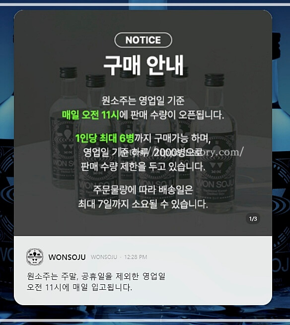 여건상 하루 2000병 이상 배송하는 게 불가능하기 때문에 원스피리츠는 당분간 온라인 판매를 임시 중단하고 한 달에 걸쳐 구매자 모두에게 배송할 것이라고 공지했습니다.