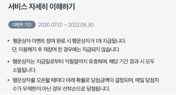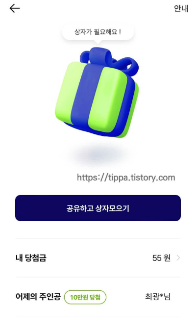 아래 링크를 통해 가입하게 되면 행운의 상자 100개를 받을 수 있고 상자를 열 때마다 최소금액 20원에서 10만 원까지 상금을 받을 수 있어 꽤 쏠쏠한 수입을 얻을 수 있습니다.