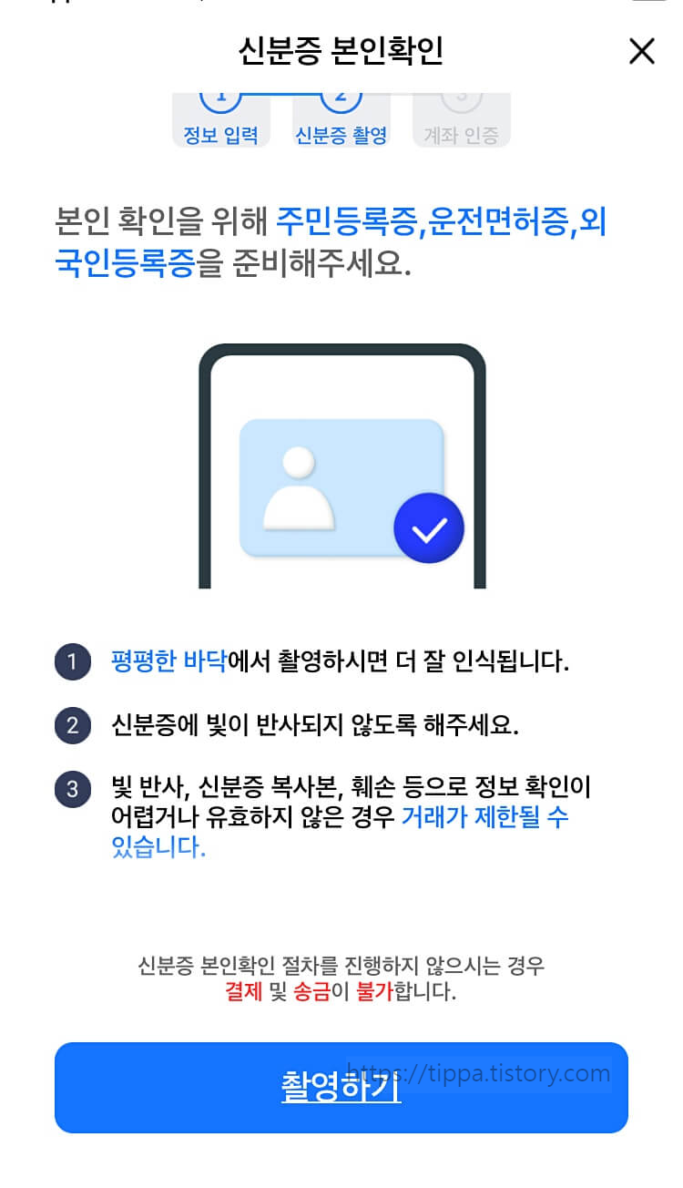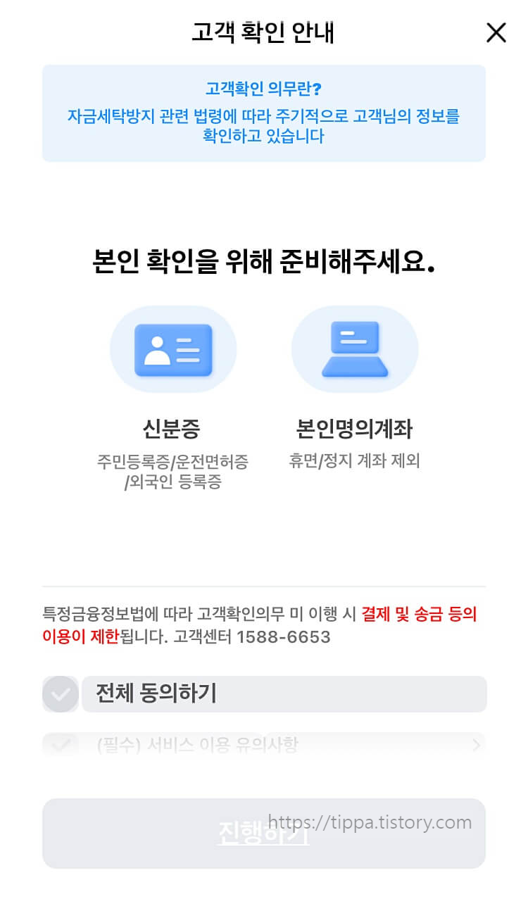 나중에 해도 되지만 입출금을 위해 신분증, 운전면허증 등으로 인증해주세요.