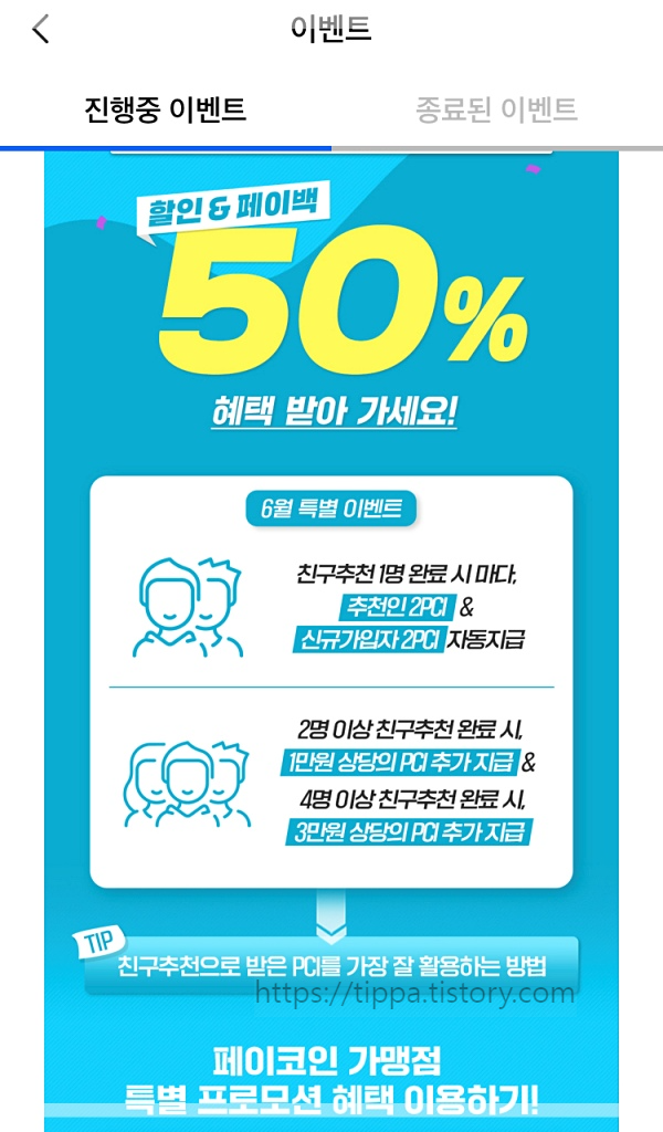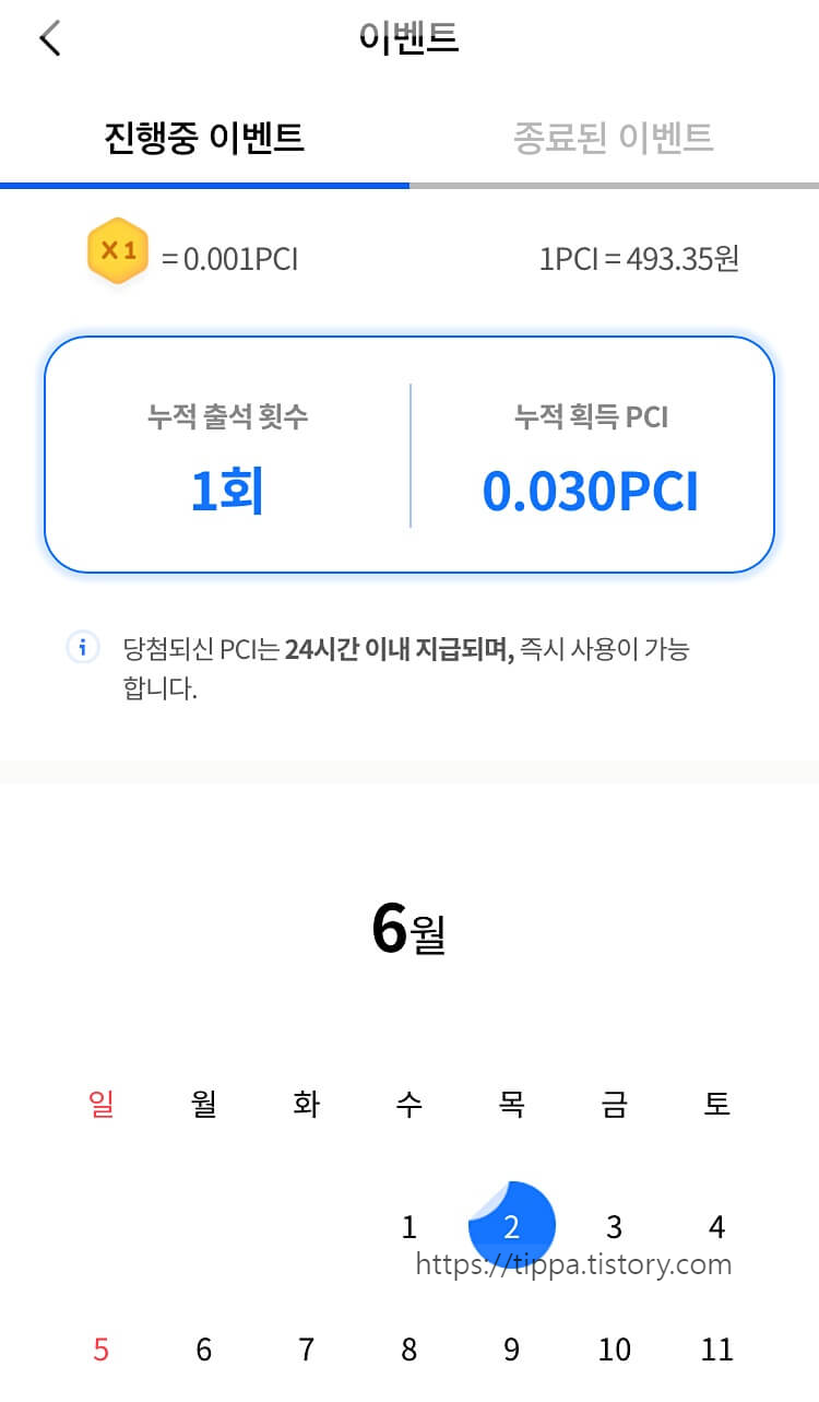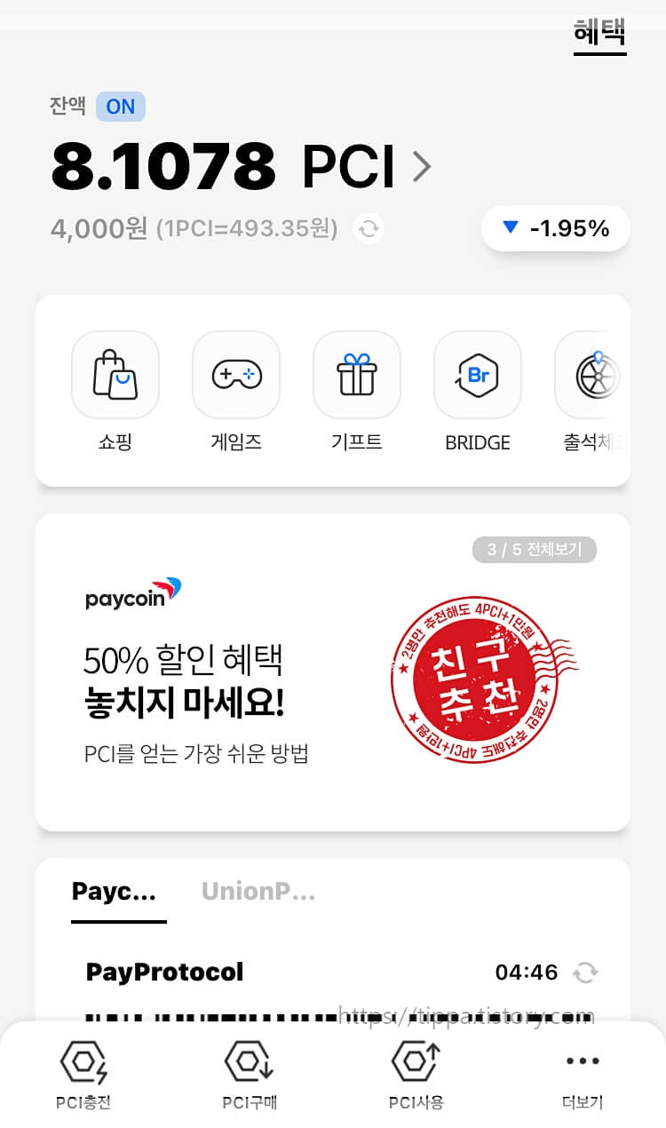 처음 앱을 깔고 추천인 코드를 입력하시면 추천인 2PCI, 신규 가입자 2PCI 자동 지급됩니다.