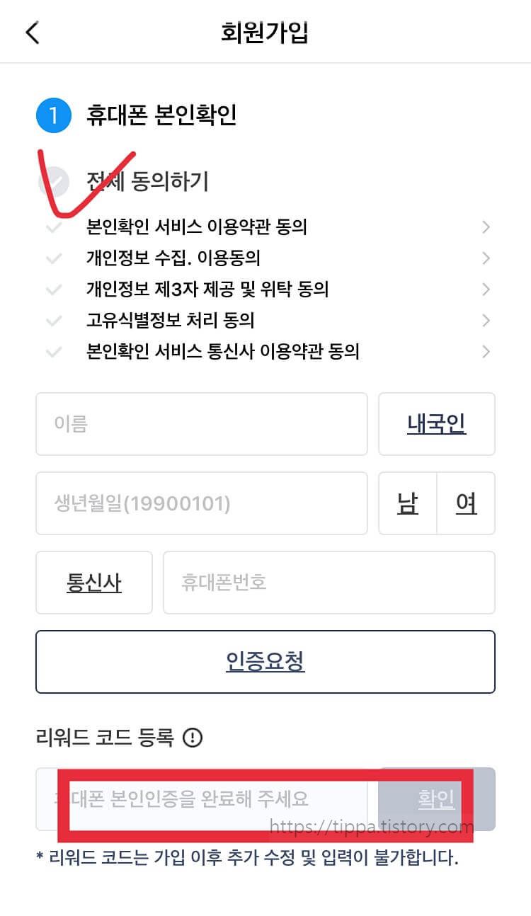3. 회원가입 시 리워드 코드 7UR3ONF 를 입력해주세요