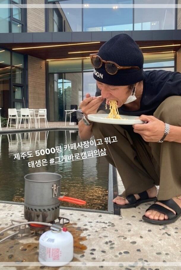 빽가는 슬리퍼를 신은채 카페 내부에 쪼그리고 앉아 라면을 먹는 사진을 공유했습니다.