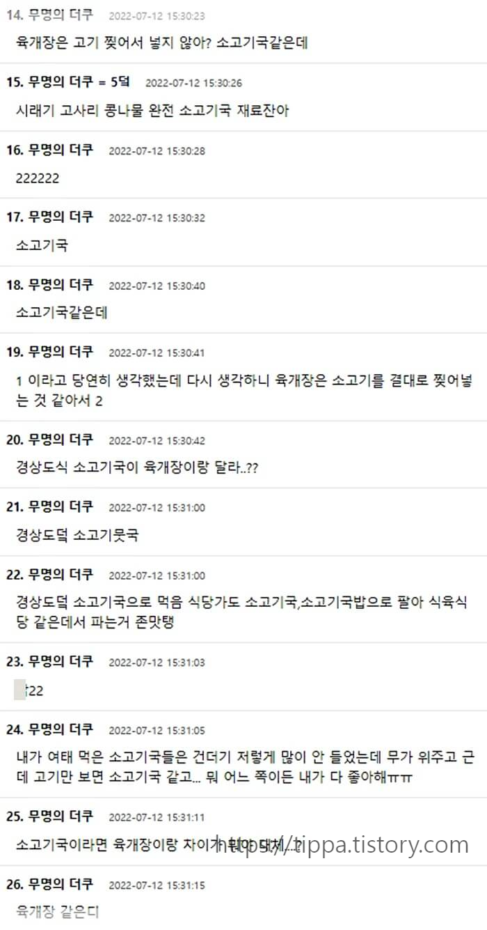 이에 온라인 커뮤니티 '더쿠' 네티즌들은 "소고기무국치고 건더기가 투머치.. 육개장이쥬..", "고기 모양이 소고기 국임" 등 치열한 갑론을박을 벌였습니다.