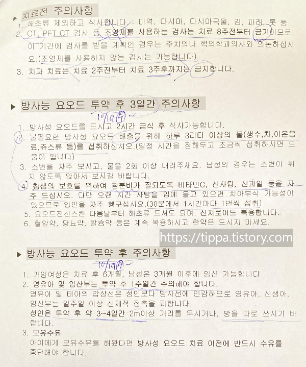 퇴원 첫 진료에서 교수님께서 상처부위를 살피시고 방사성 치료를 할지에 대한 결정이 내려지며, 핵의학과에서 어떤식의 치료가 이루어질지 상담후 예약하게되요.