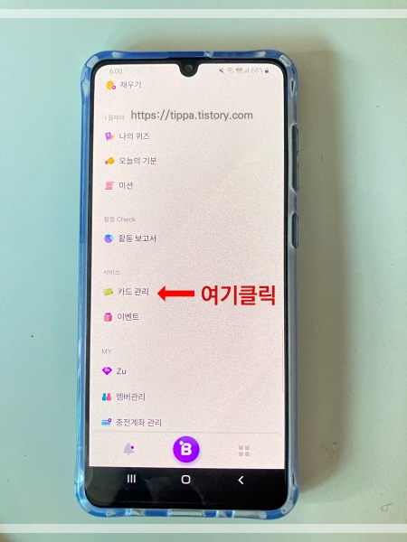 앱 오른쪽 하단 네모 네 개를 클릭하면 중간쯤 카드관리- 카드신청을 하시면 되고, 아이핸드폰에서 카드를 신청하며 카드 신청 시 부모 인증 문구가 뜨면 순서에 따라 해 줍니다.