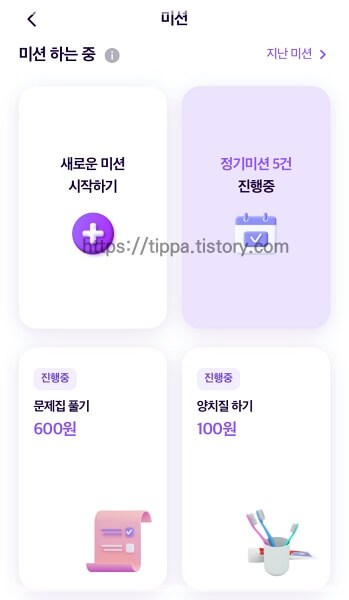 미션은 정기미션을 등록할 수 있는데 소소한 용돈 모으기용으로 아이들에게 기쁨을 주네요.