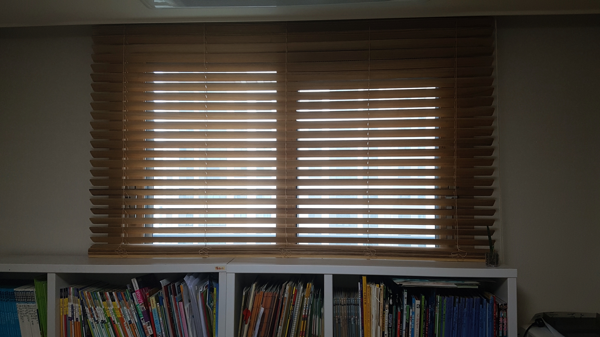앞에 아파트가 마주 보고 있어서 가려 야하기 때문에 좀 더 길게 재단했었는데 밑에 책꽂이는 놓는 바람에 조금 올려서 쓰고 있어요. 완전히 닫지 않고 살짝 열어놓아서 앞에 건물이 보이네요.