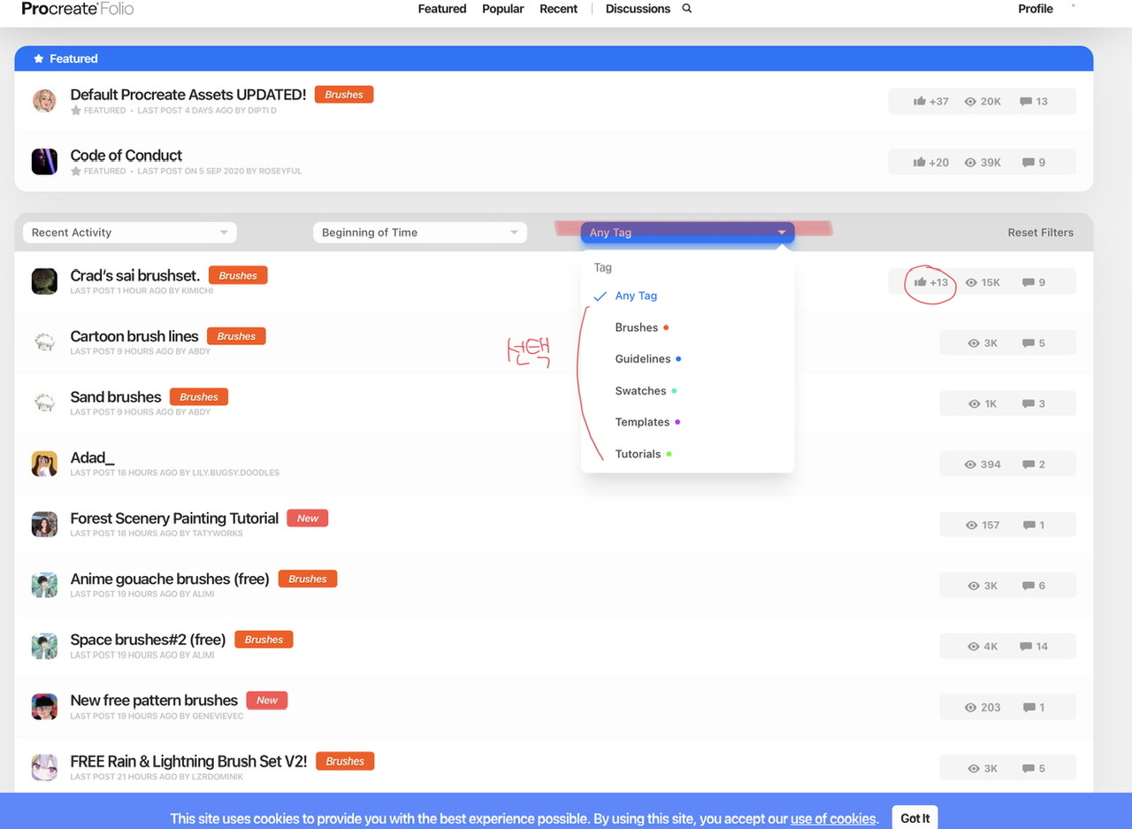 Any tag 에서 브러쉬 스와치등 클릭해서 검색하시면 되고 엄지손가락의 숫자는 '좋아요' 표시라서 많은사람들이 좋아요라고 눌렀다면 그만큼 인기가 있는거겠죠.